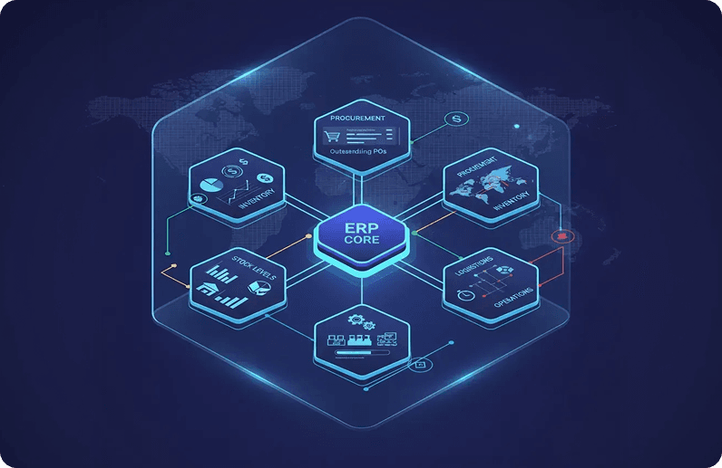 ERP solutions act as the central system of record, integrating finance, procurement, inventory, manufacturing, and operations into a unified platform that enables control, accuracy, and scalability.